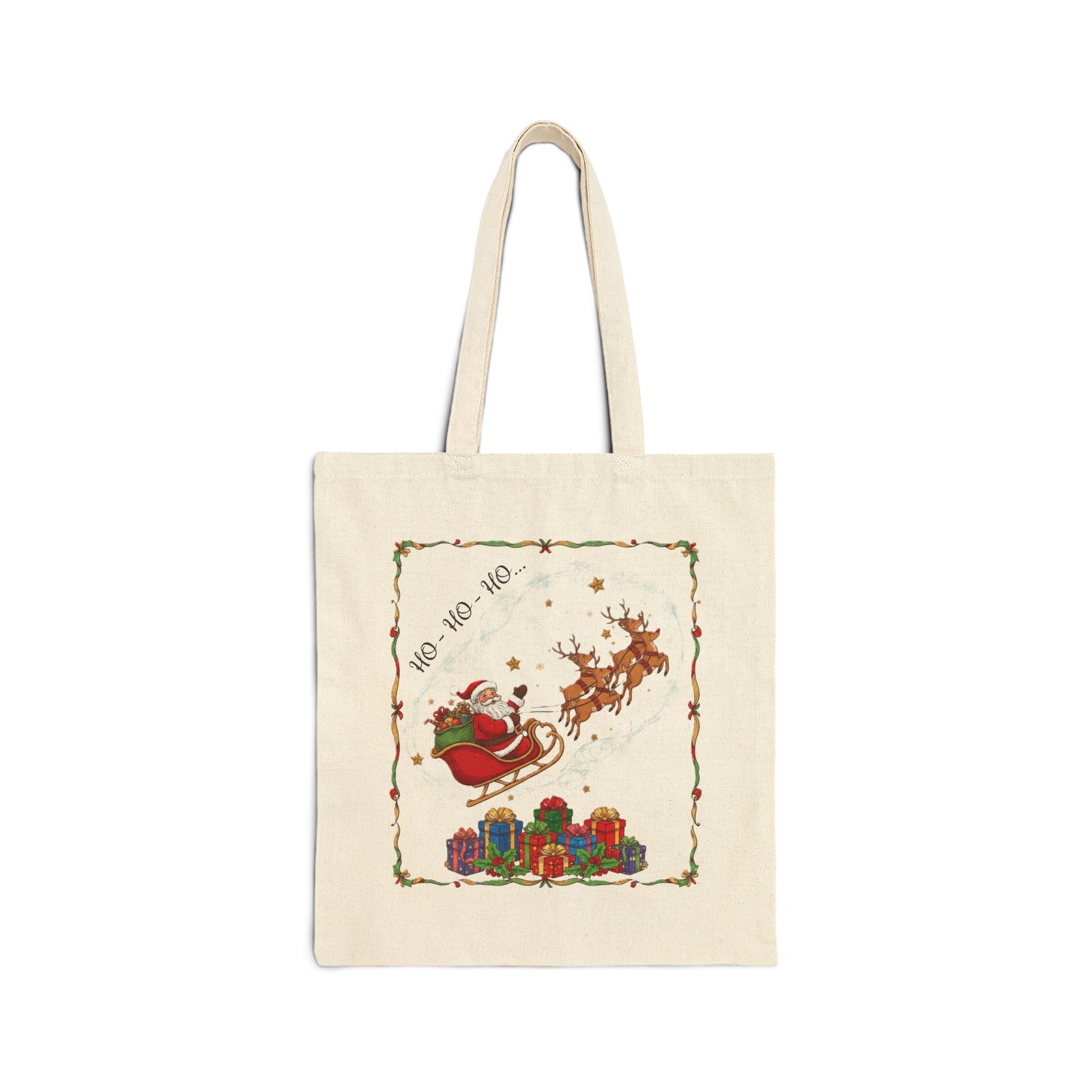 Santa and Reindeer Christmas Tote Bag – Festive Holiday Illustration with Gifts & Stars
