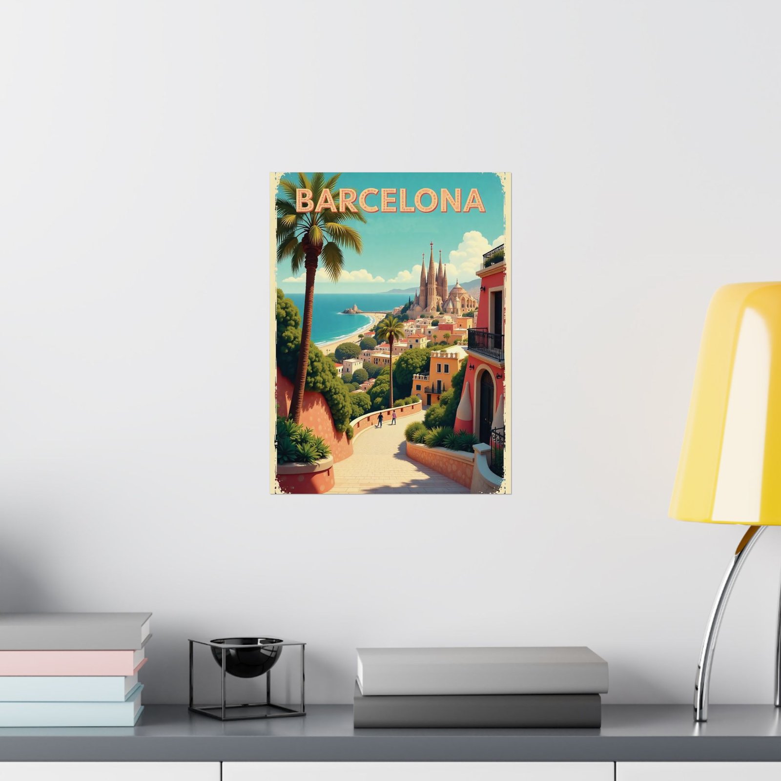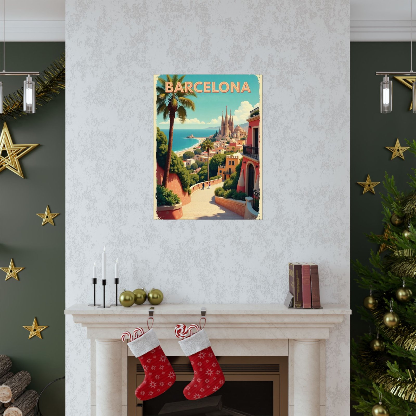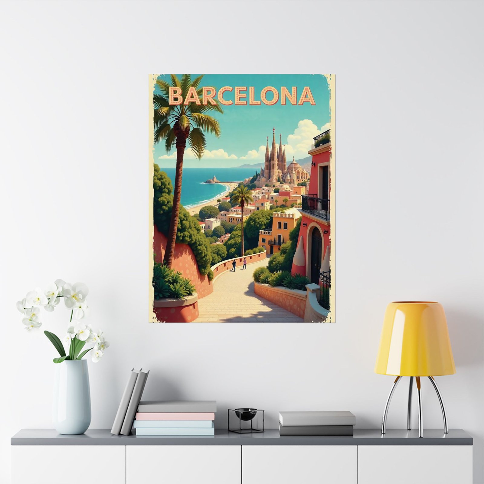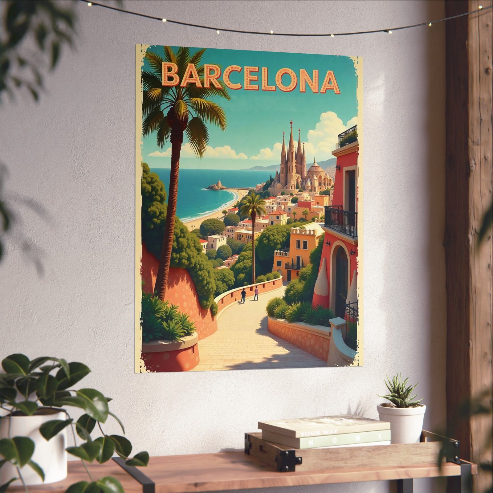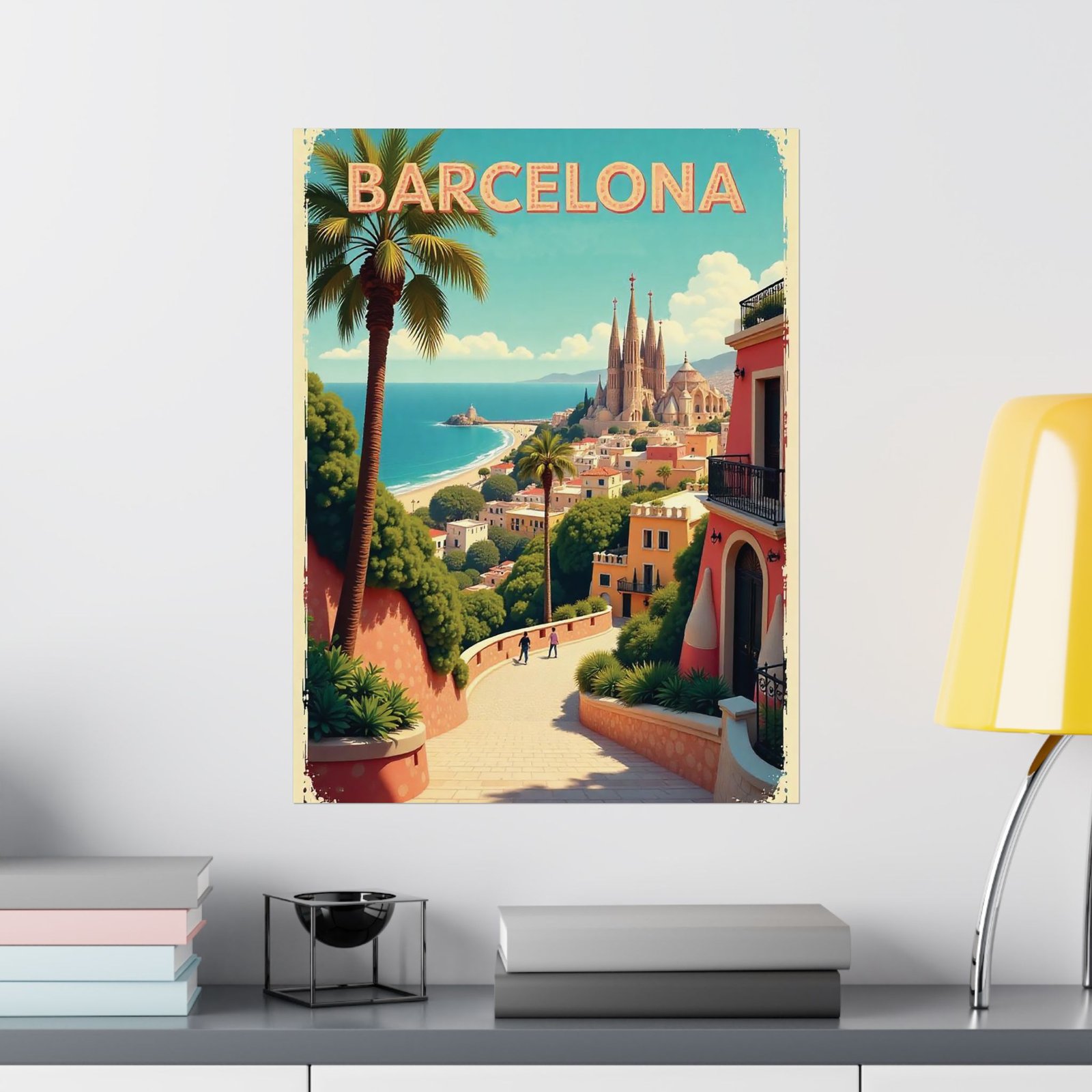 Inspired by the golden era of mid-century European travel posters, this print features iconic landmarks like La Sagrada Família, Park Güell, and the colorful tiled rooftops of Barcelona. Designed in a rich palette of sun-washed terracotta, ochre, and sky blue, it captures the city’s coastal charm and architectural elegance in a way that’s both retro and modern.