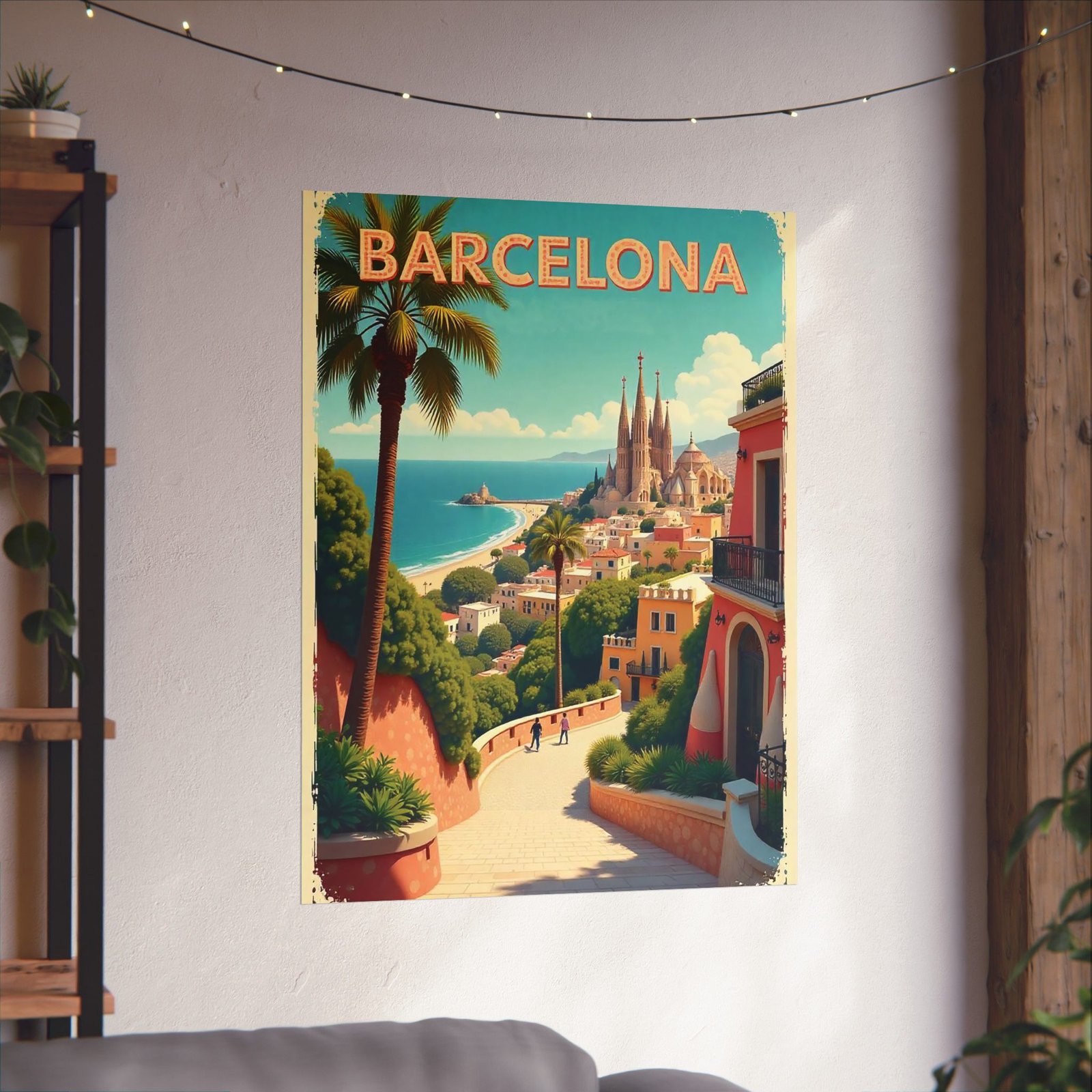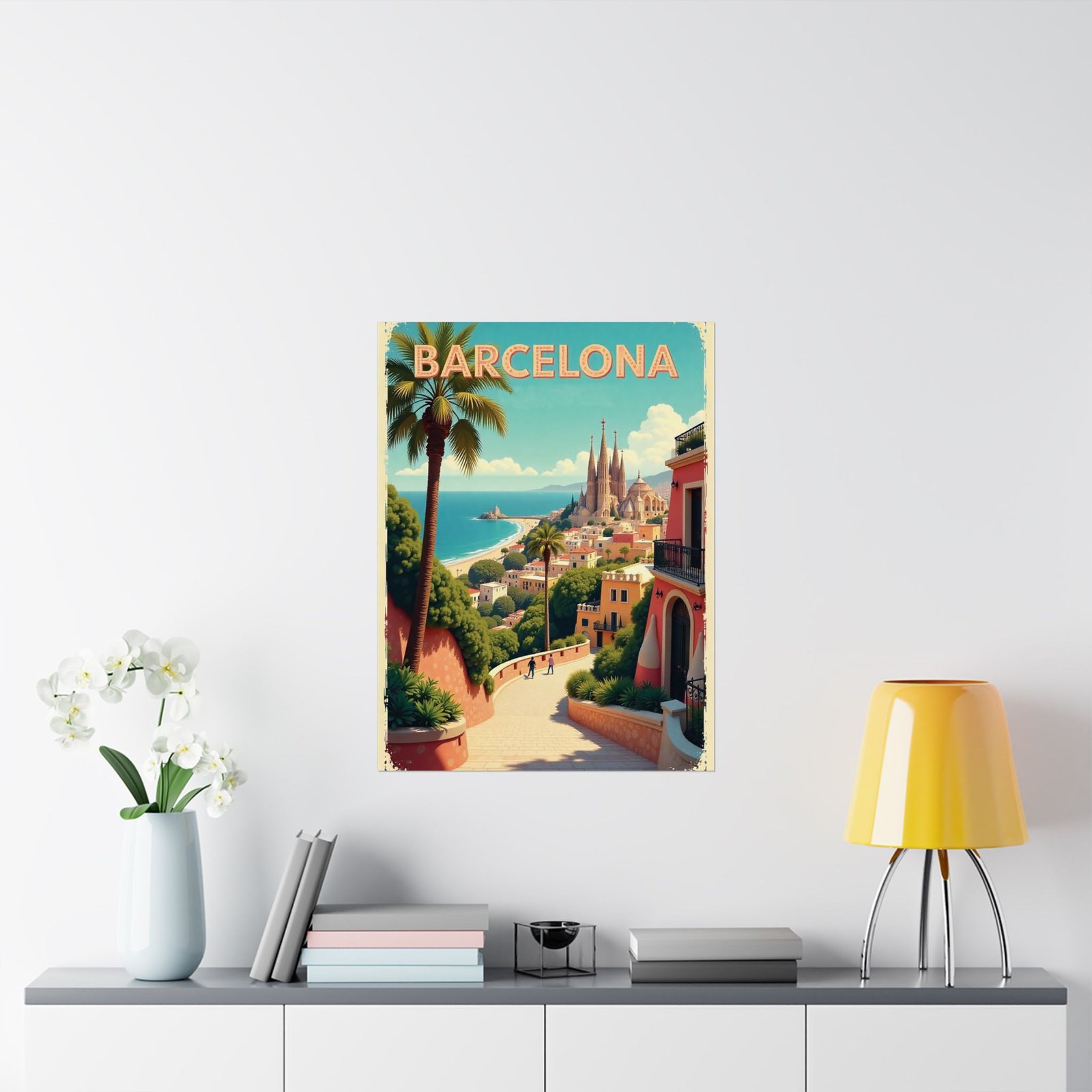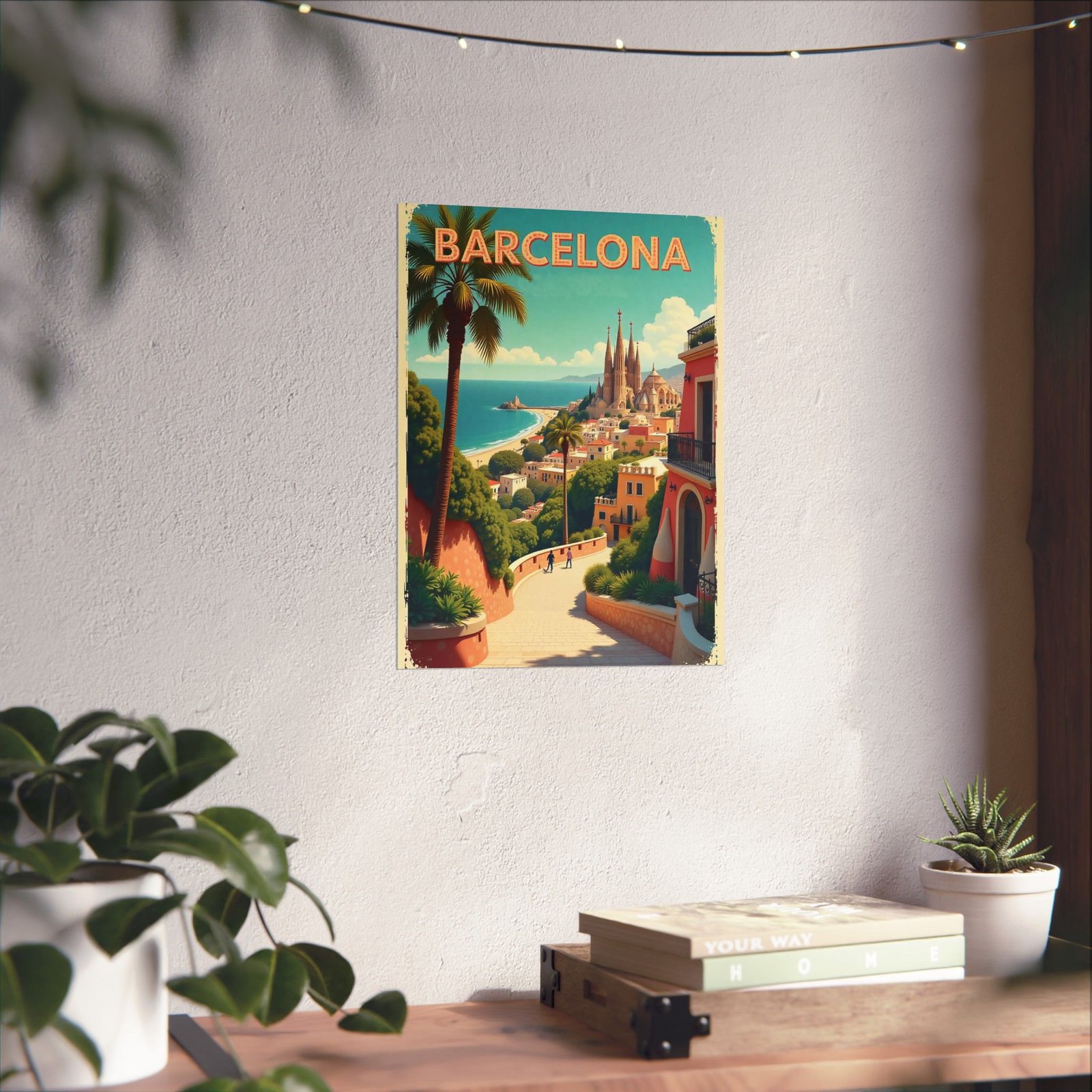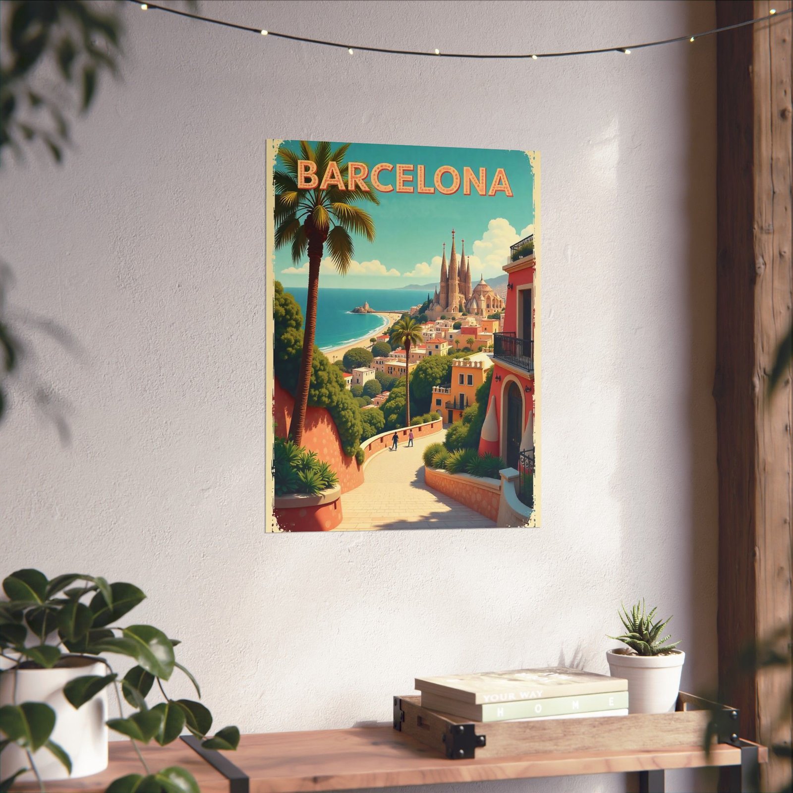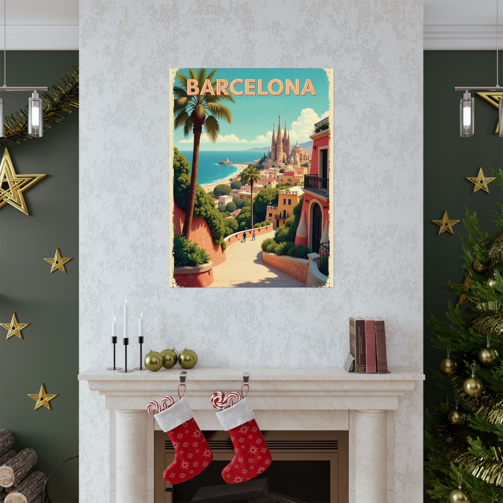 Inspired by the golden era of mid-century European travel posters, this print features iconic landmarks like La Sagrada Família, Park Güell, and the colorful tiled rooftops of Barcelona. Designed in a rich palette of sun-washed terracotta, ochre, and sky blue, it captures the city’s coastal charm and architectural elegance in a way that’s both retro and modern.