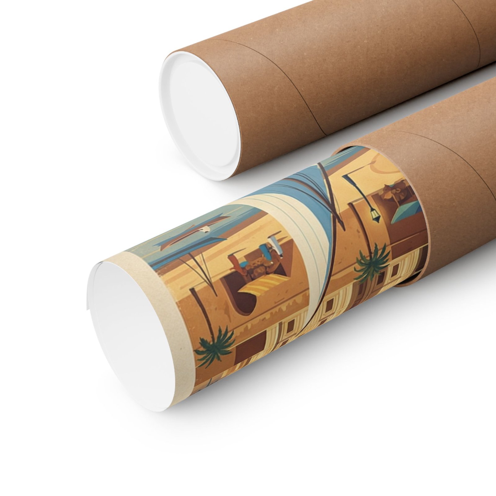 Inspired by mid-20th-century travel posters, this artwork blends clean, stylized illustrations with bold shapes and flat painterly colors. Subtle life and atmosphere include camel silhouettes, palm trees, bustling streets, and feluccas on the Nile, all bathed in golden sunlight casting long shadows for a late-afternoon glow. The color palette of sandy gold, warm ochre, terracotta, vivid blues, and deep indigo accents adds vibrancy and authenticity.