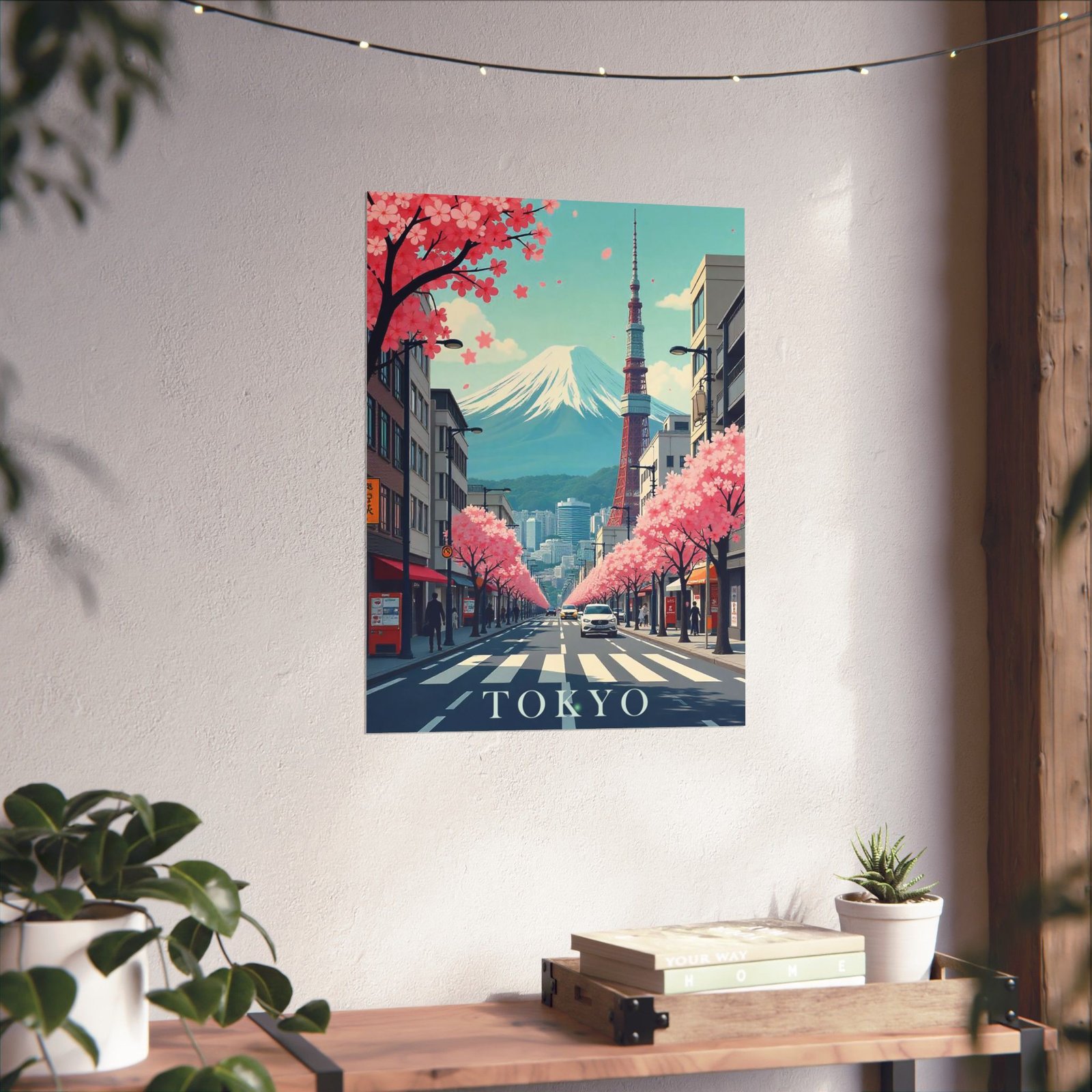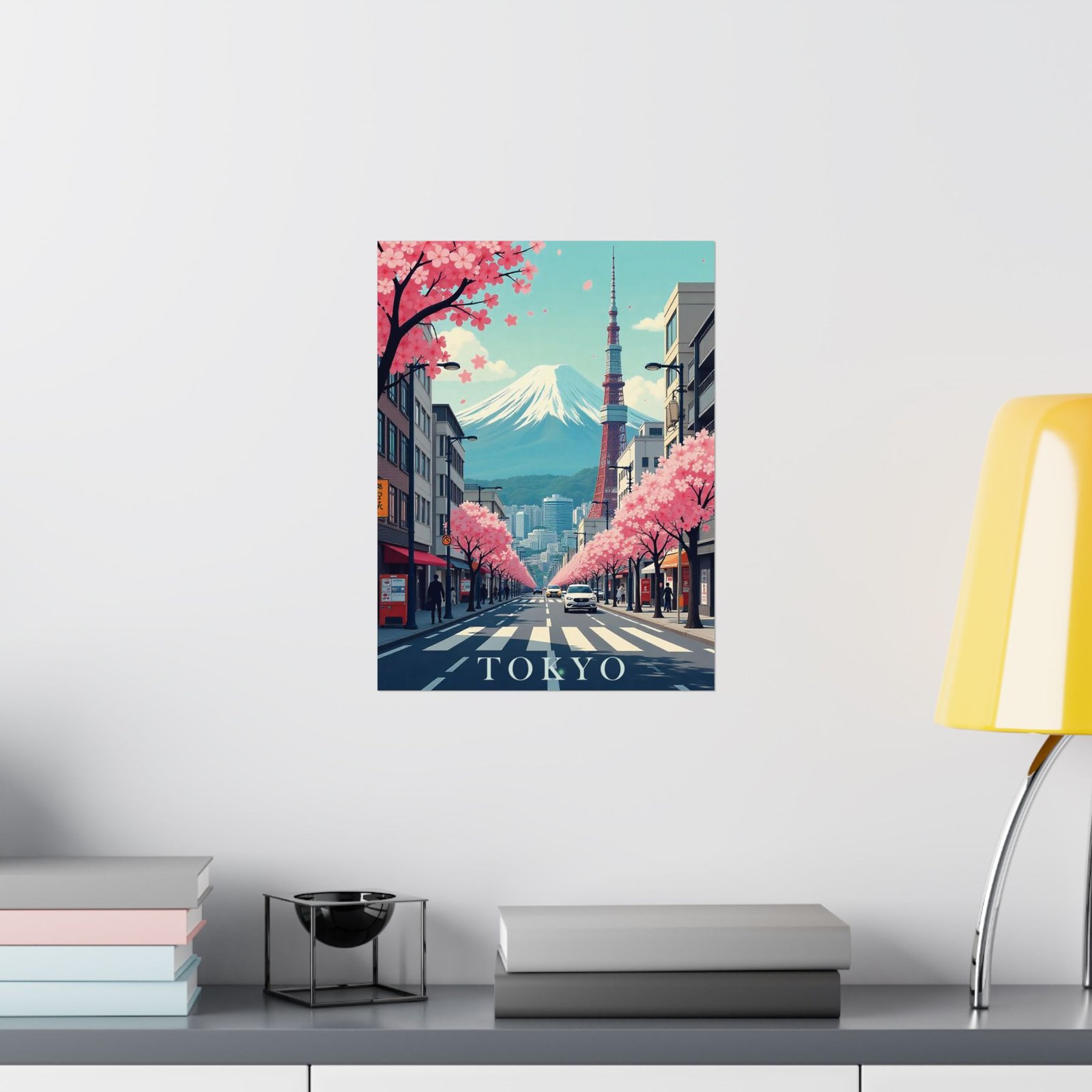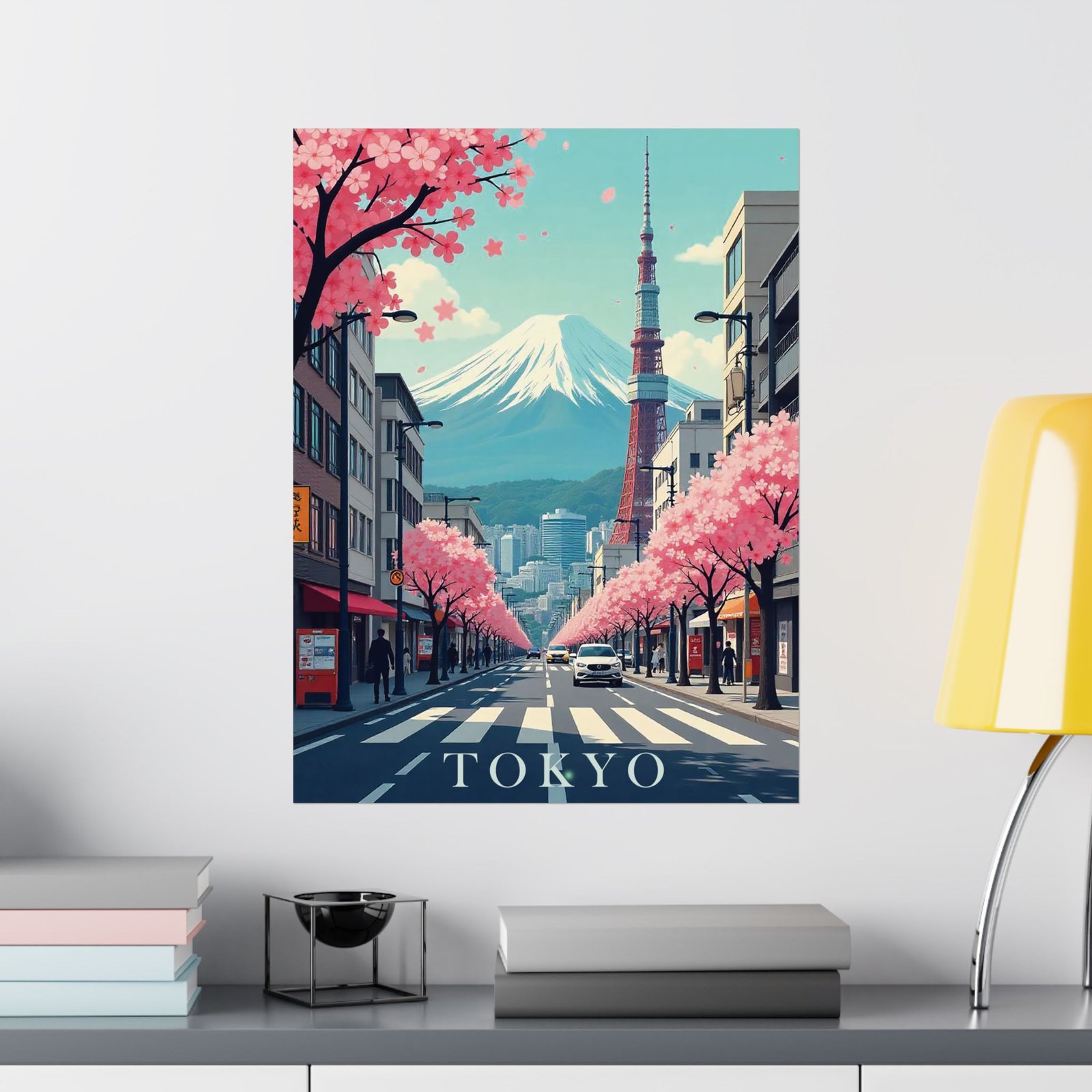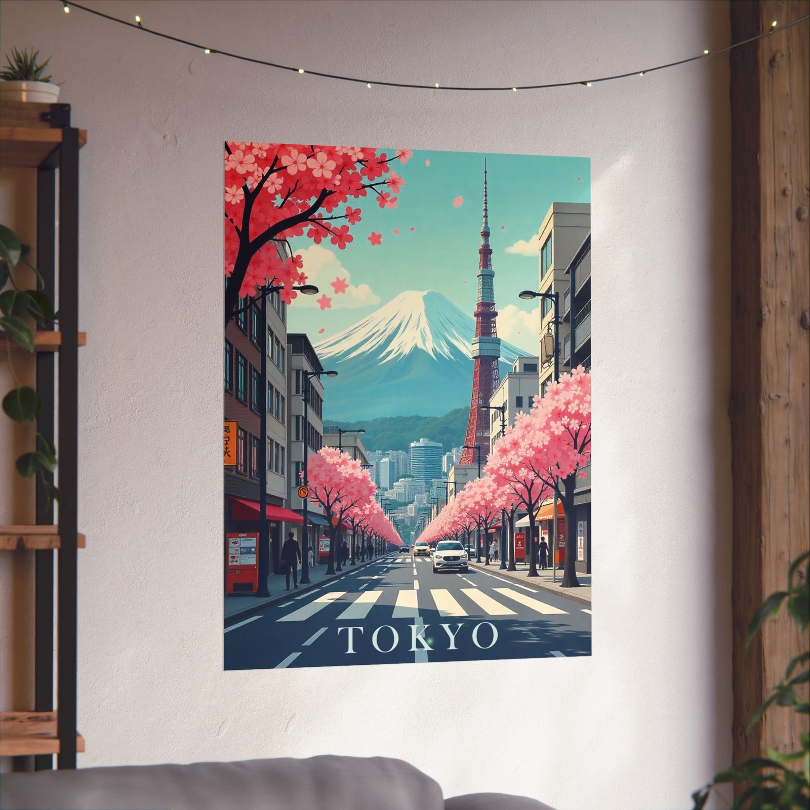 Inspired by classic mid-century travel posters, this print features iconic Tokyo elements from Mount Fuji and Tokyo Tower to cityscapes and cherry blossoms reimagined in a retro-modern aesthetic with bold typography and soft, nostalgic hues.
