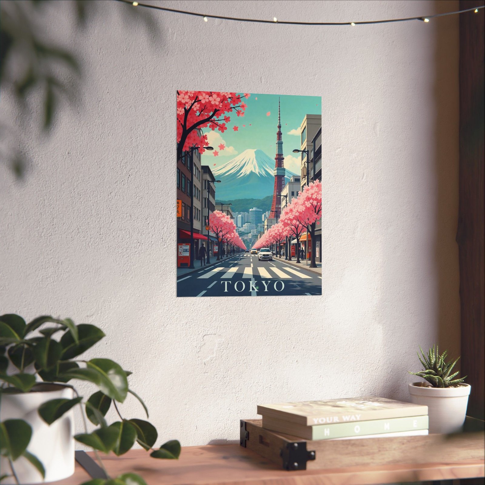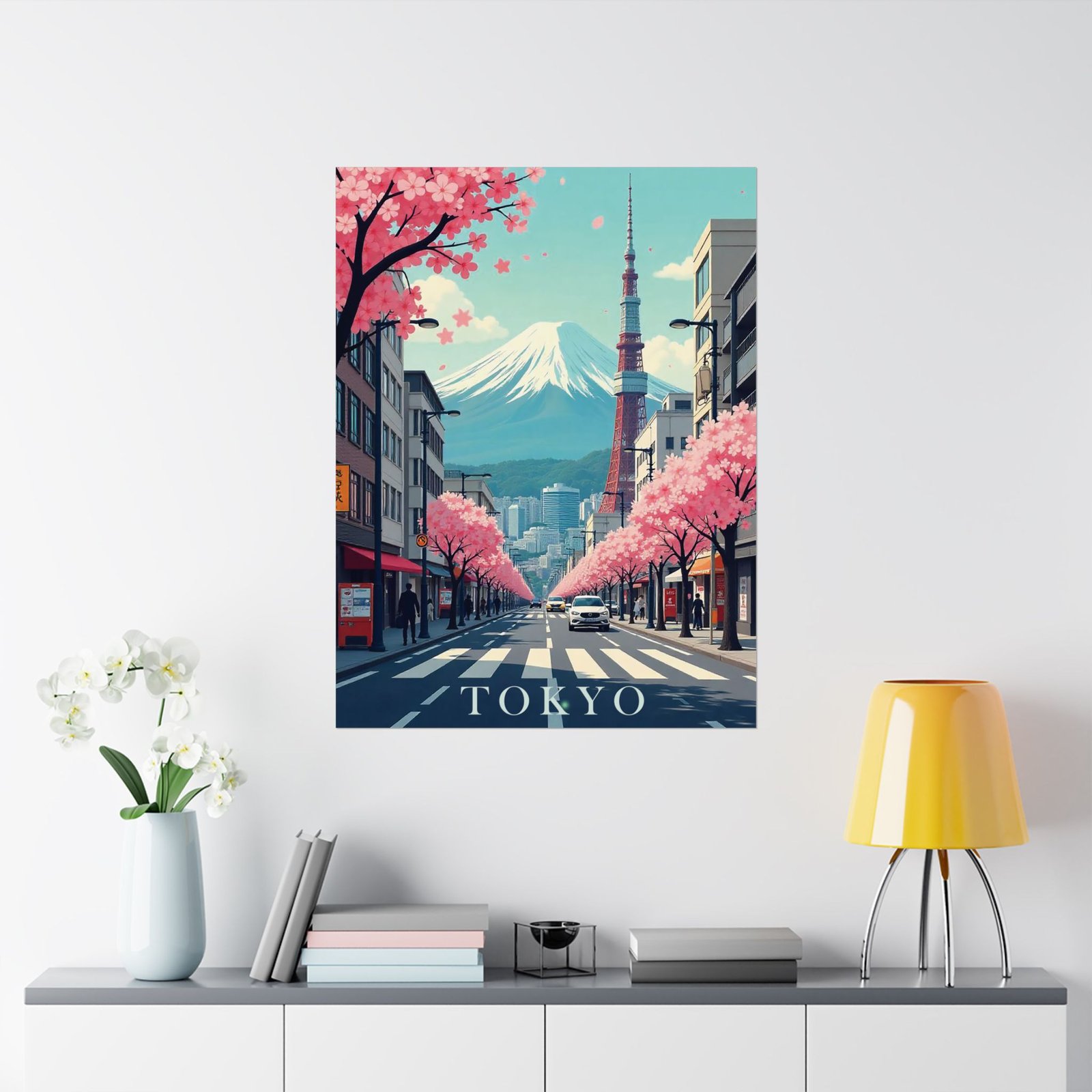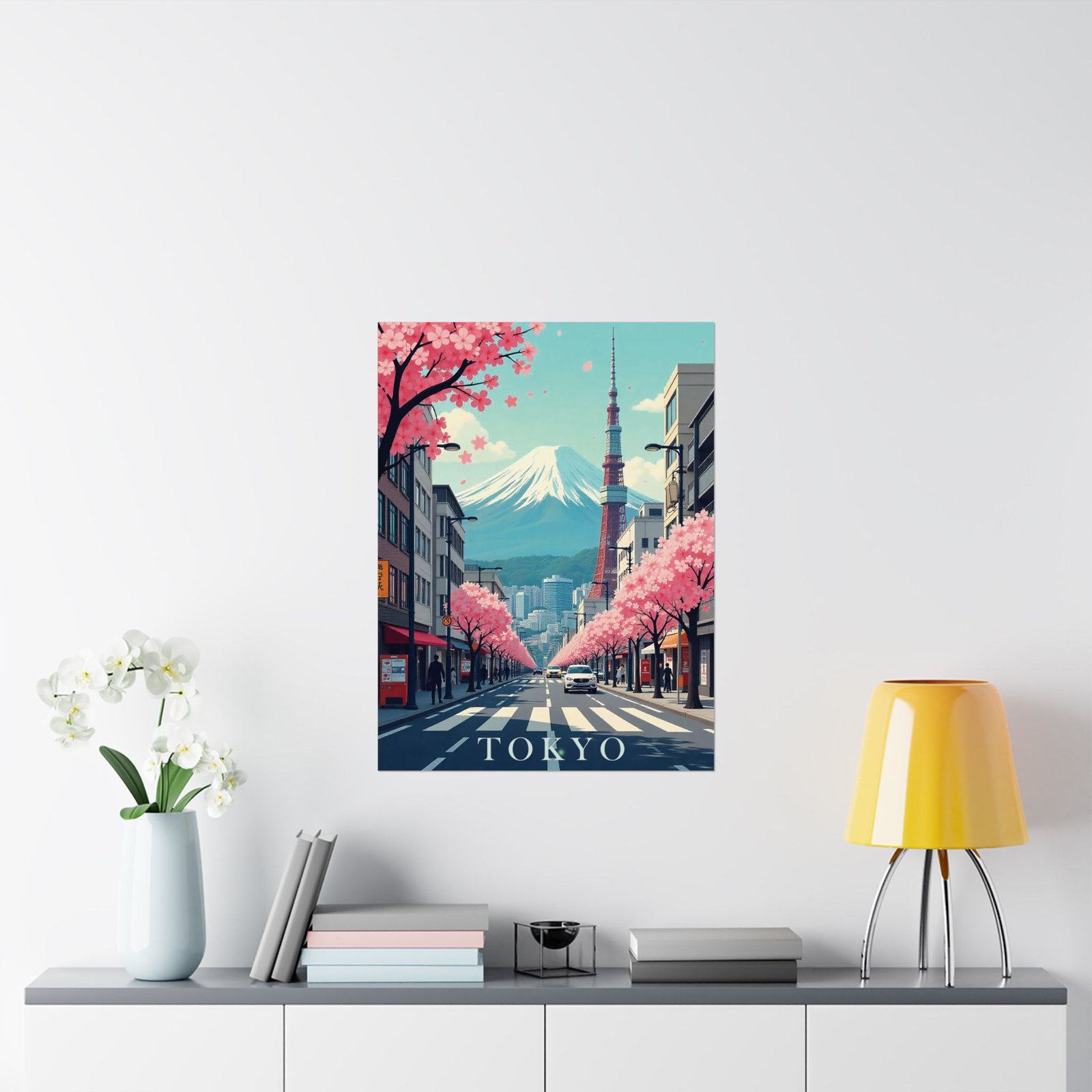 Inspired by classic mid-century travel posters, this print features iconic Tokyo elements from Mount Fuji and Tokyo Tower to cityscapes and cherry blossoms reimagined in a retro-modern aesthetic with bold typography and soft, nostalgic hues.