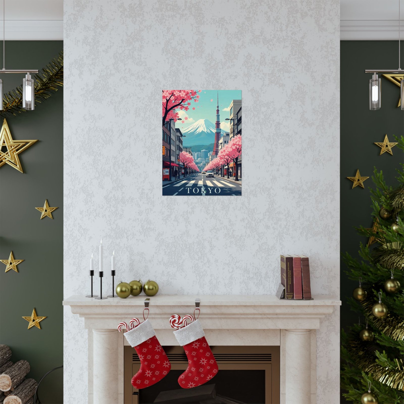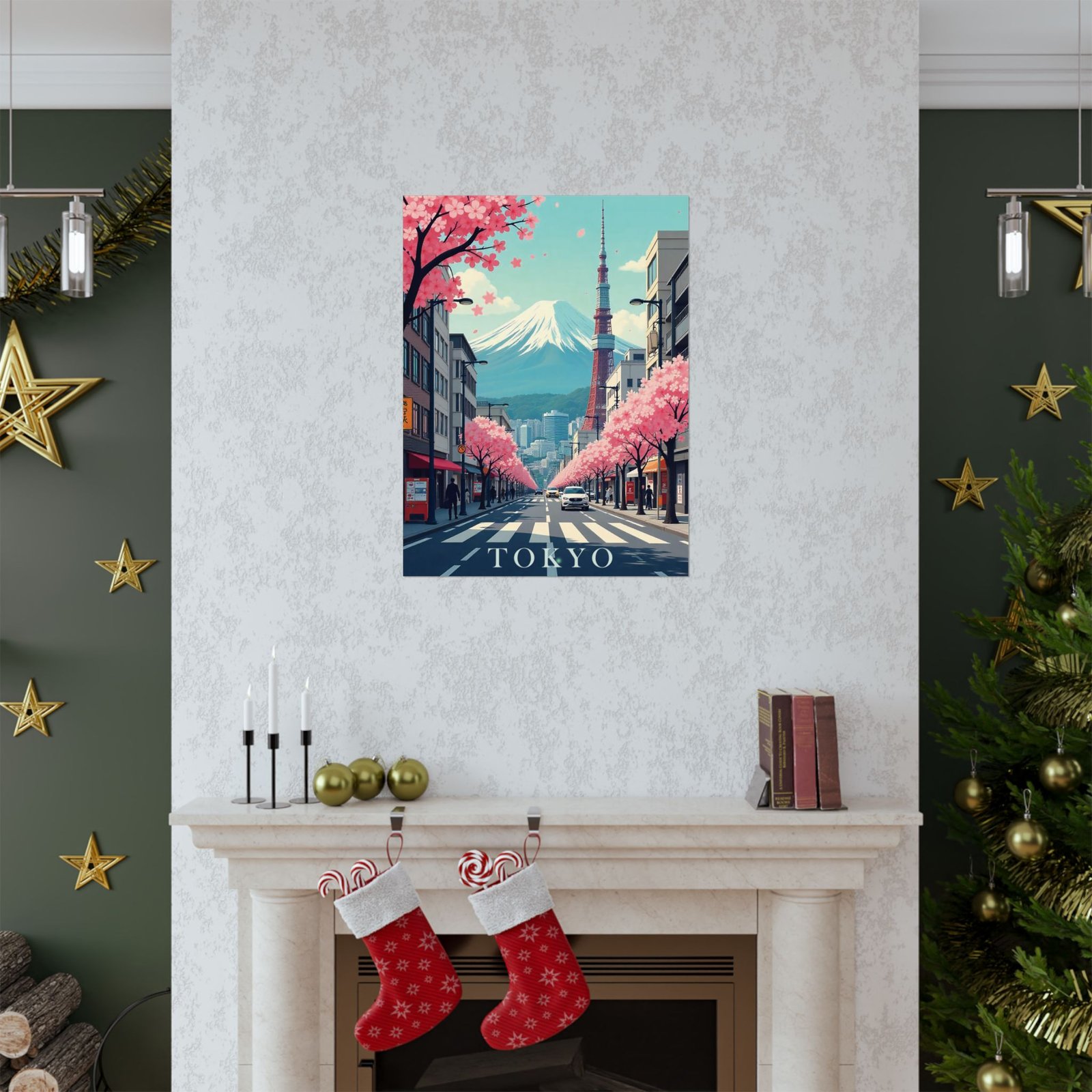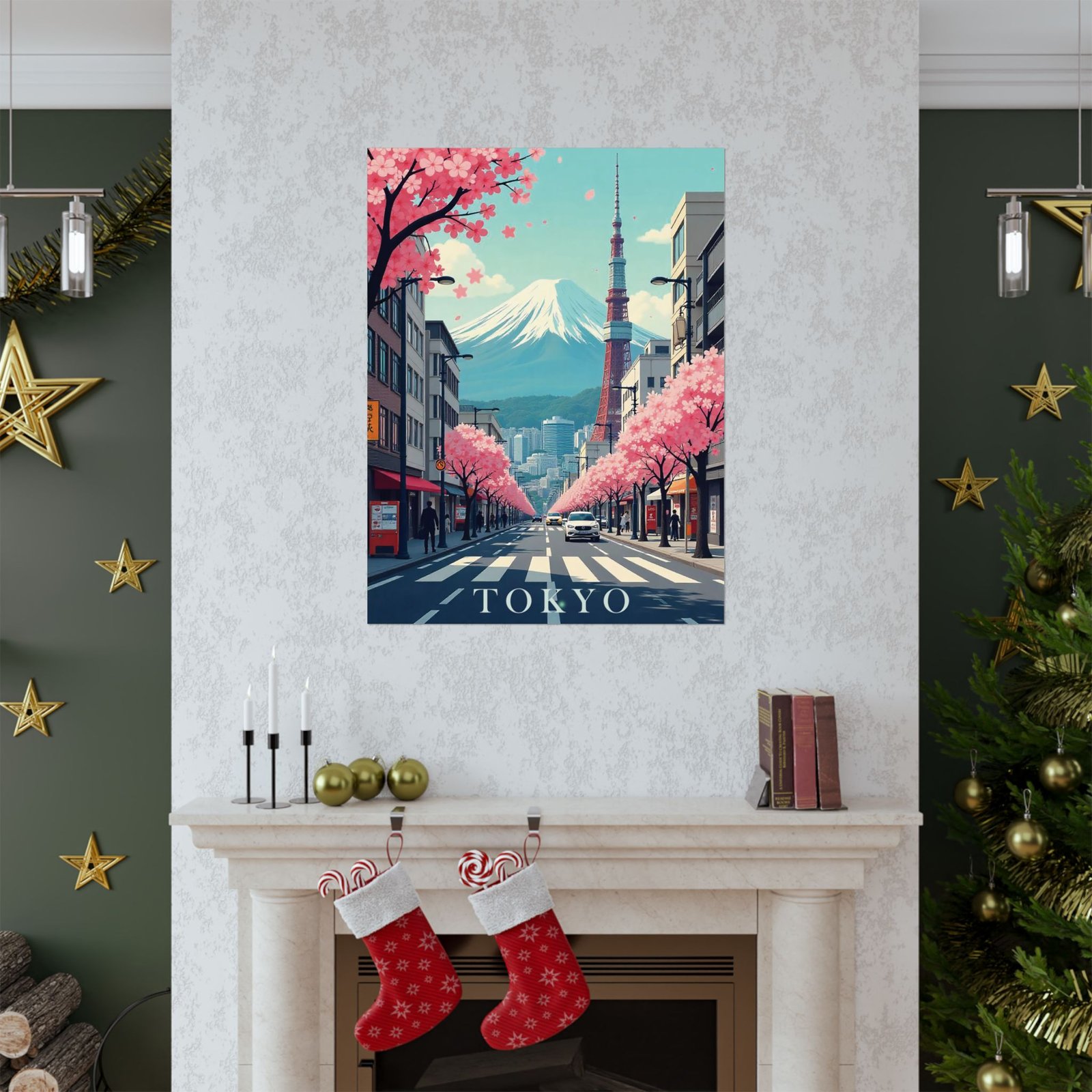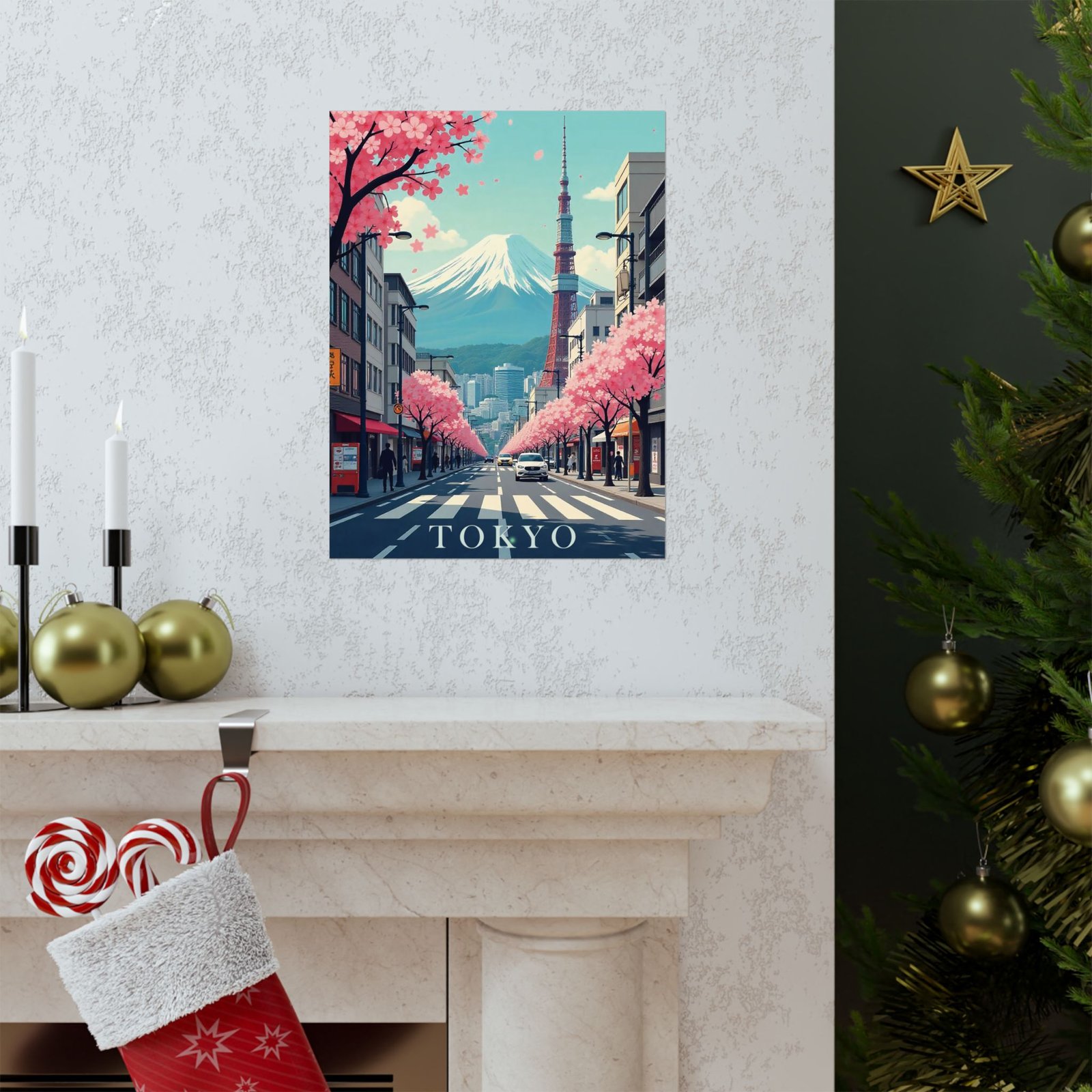 Inspired by classic mid-century travel posters, this print features iconic Tokyo elements from Mount Fuji and Tokyo Tower to cityscapes and cherry blossoms reimagined in a retro-modern aesthetic with bold typography and soft, nostalgic hues.